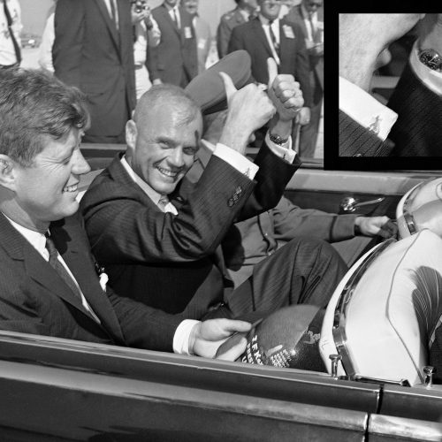 The stories of Heuer stopwatch and the LeCoultre “Mercury 7” watch have been told in considerable detail, so — rather than repeating these stories — this posting will present an “album” showing some favorite photos of Glenn wearing the two watches, around the time of his flight. We will use the “watch spotting” perspective, showing Glenn wearing them, for example, while he trained for his flight, as he walked to the Friendship 7 capsule, and in the limousine with President John F. Kennedy, for the celebratory parade. For detailed information about John Glenn’s use of the Heuer Reference 2915 A stopwatch, see our posting from 2006 – John Glenn’s Heuer. [The posting is old and ugly, and most of the links are broken, but the information and images are there!] For detailed information about John Glenn’s LeCoultre “Mercury 7” watch, see the posting on Hodinkee – My Hunt for John Glenn’s Watches.