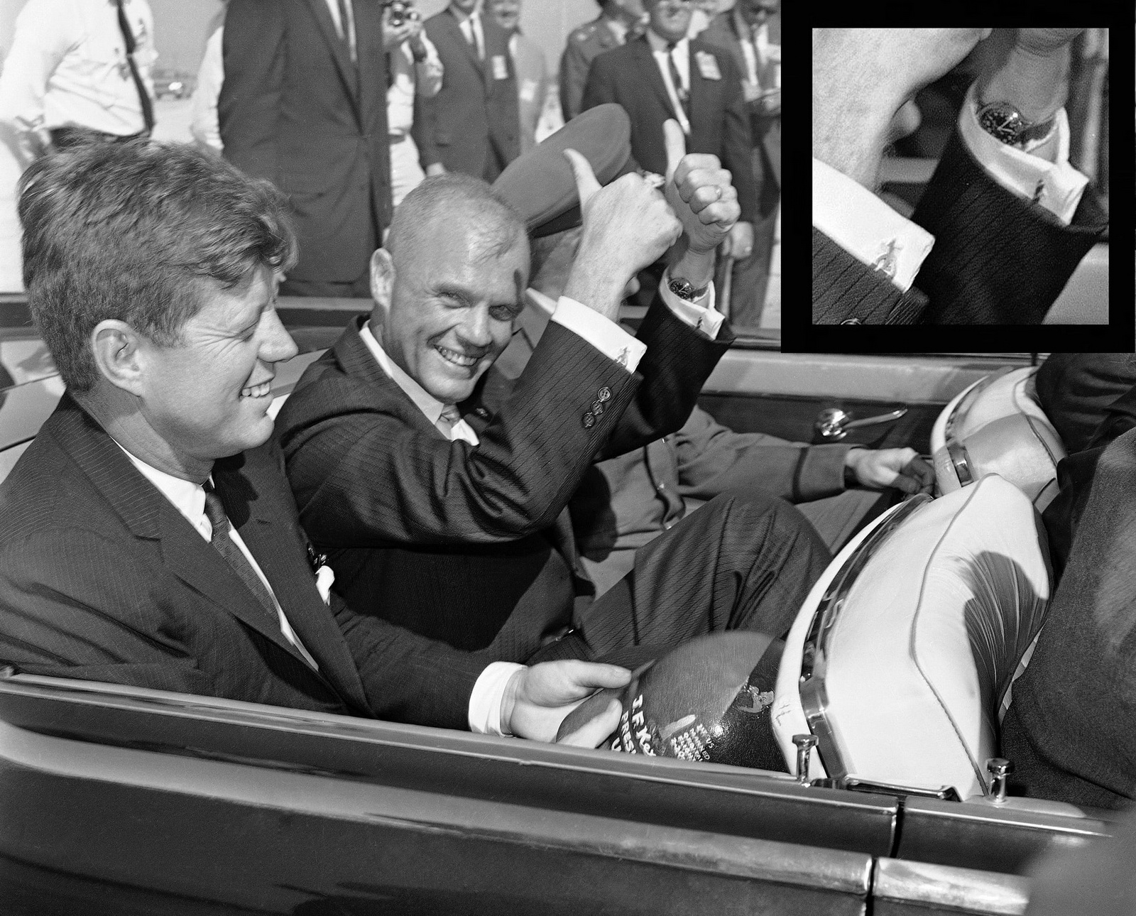In the photograph below (from 1964), John Glenn seems to be wearing an Accutron Astronaut, with the distinctive coffin-shaped links on the bracelet being the easy telltale for the watch.