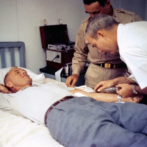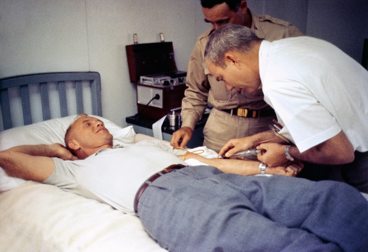 For the MA-6 flight, there were 20 “recovery ships” positioned at various locations around the globe, so that Glenn and the Freedom 7 capsule could be recovered if he were to splash down outside the planned recovery zone. Glenn was picked up by the destroyer Noa approximately 20 minutes after his splash down, was then transferred to the aircraft carrier Randolph, and then he traveled by helicopter to Grand Turk Island, where he stayed for two days of debriefings and medical tests. Glenn arrived on Grand Turk Island at around 9:00 PM on February 20, 1962, and summed up his day as follows — “It was a long day and a very interesting one.”