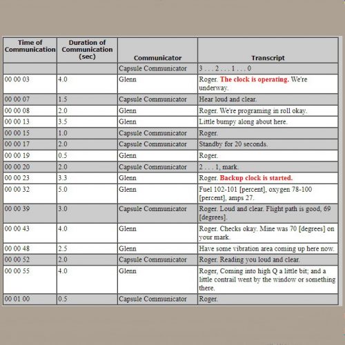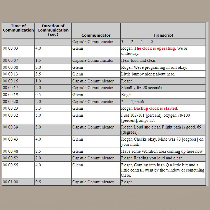 The Heuer stopwatch appears to have been used as a “backup” timer for Glenn’s flight. The instrument panel of the Friendship 7 capsule included a digital timer indicating “Time from Launch”, so Glenn must have wanted a back-up timer that he would wear on his wrist. The second hand of the Heuer stopwatch was propositioned at the 20-second mark, and the transcript for the flight shows that at the 17 second mark of the flight the “Capsule Communicator” (Cap Comm) said, “Standby for 20 seconds”, followed by the “mark” signal, and at the 23 second mark of the flight Glenn confirmed “Back-up clock is started.”