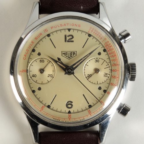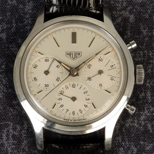 Manual-wind; three register chronograph; dauphine hands with luminous inserts; Valjoux 72 movement; stainless steel case, measures 36.4 millimeters, across the dial