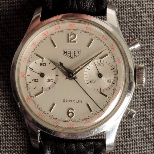 Manual-wind; two register chronograph; dauphine hands with luminous inserts; Valjoux 22 movement; stainless steel case, measures 37.0 millimeters, across the dial; screwback, with inset polygon design
