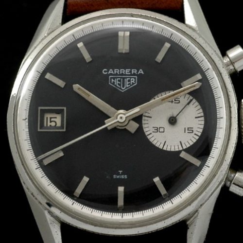 Carrera 30 chronographs are manual-wind, two register chronographs, with 30 minute capacity; they have second execution dials (wider, faceted applied steel or gold markers) and second execution hands (wider, polished steel or gold hands, with black and luminous inserts)