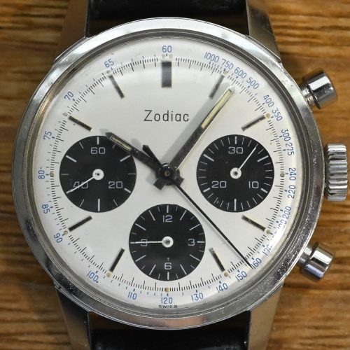 Zodiac Reference 4555 is a manual-wind, three-register chronograph (12 hour capacity), in a stainless steel case; Valjoux 72 movement