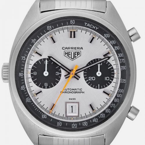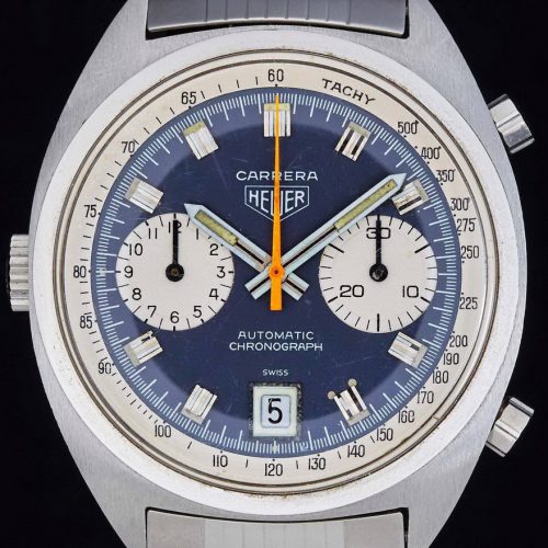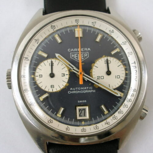 Carrera Reference 110.253 G has third execution dial (luminous starburst finish); fourth execution hands (painted steel, with black edges and full-length lume); the word "Carrera" is narrower than on other models, and does not extend beyond the Heuer shield.