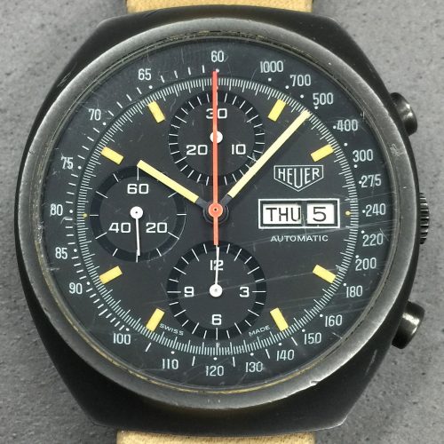 Pasadena chronographs are automatic, three-register chronographs, with black dial and registers; 12-hour capacity; date or day/date at three o'clock; tachymeter scale in inner bezel; use Valjoux 7750 movement