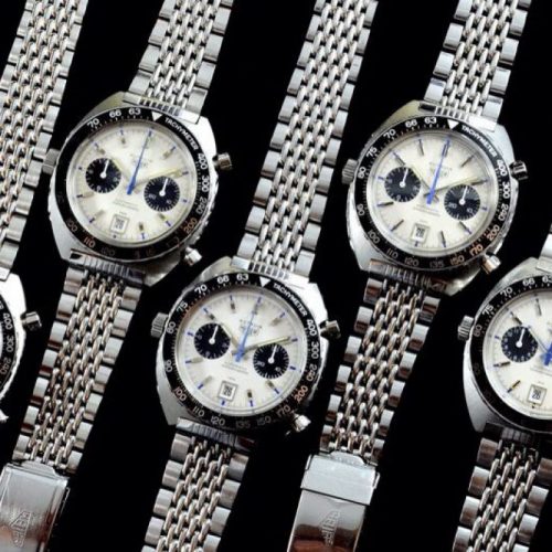 Autavia Reference 1163 T is an automatic; two-register chronograph (12-hour recorder); white dial with black registers in blue accents; date at six o'clock; rotating tachymeter bezel