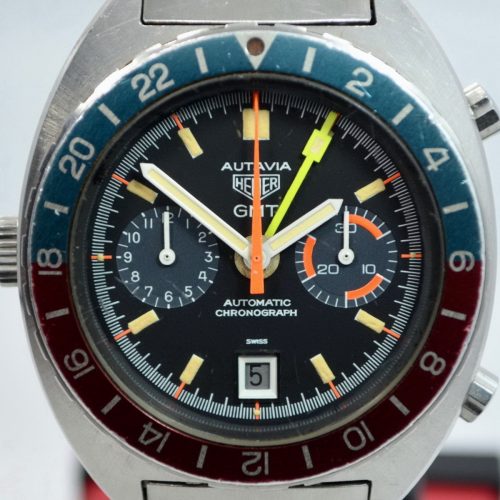 Automatic; Two-register chronograph; Black dial; 12-hour recorder; Date at six o'clock; GMT hand and rotating GMT bezel (with numerals for even numbers)