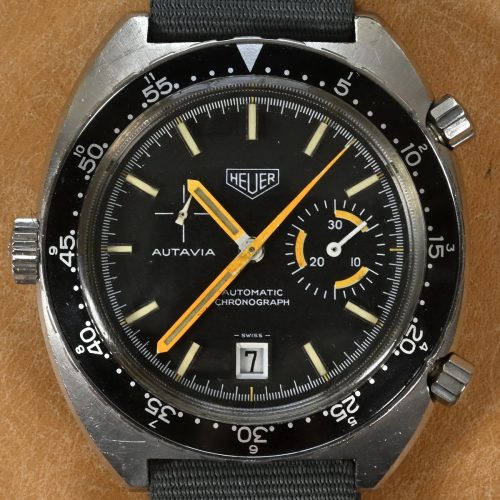 Reference 1563 is an automatic, two-register chronograph (30 minute recorder and running seconds); date at six o'clock; rotating bezel; plastic crystal