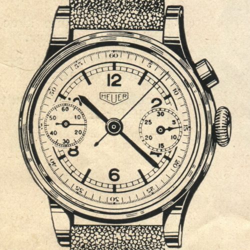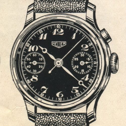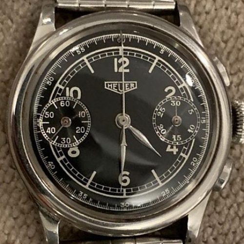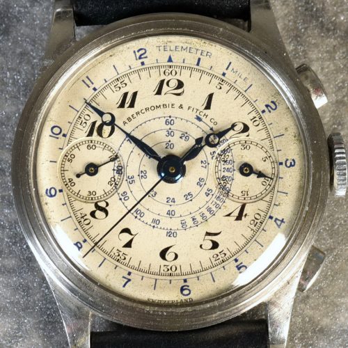 Reference 2403 is a manual-wind, two-register chronograph (30 minute capacity) in a stainless steel case; uses Landeron 13 movement (13 ligne)