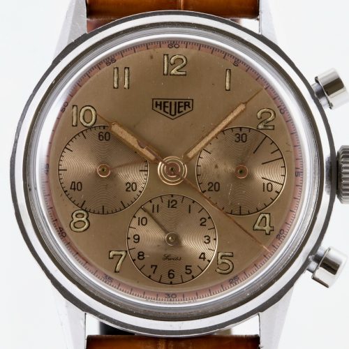 Reference 2447 is a manual-wind, three-register chronograph (12-hour capacity); 38 millimeter, stainless steel screw-back case has round pushers and angular lugs; Valjoux 72 movement (13 ligne). Reference 2455 is 14 karat gold; Reference 2456 is 18 karat gold.