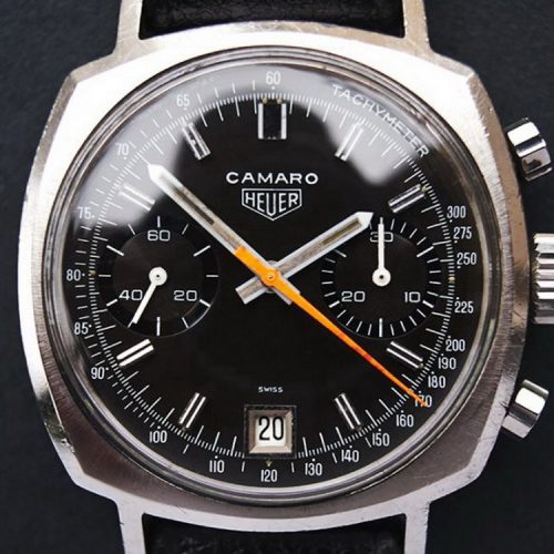 Camaro Reference 73443 is a manual-wind, two-register chronograph (30 minute capacity), with date; markers are longer than on earlier models; Valjoux 7734 movement