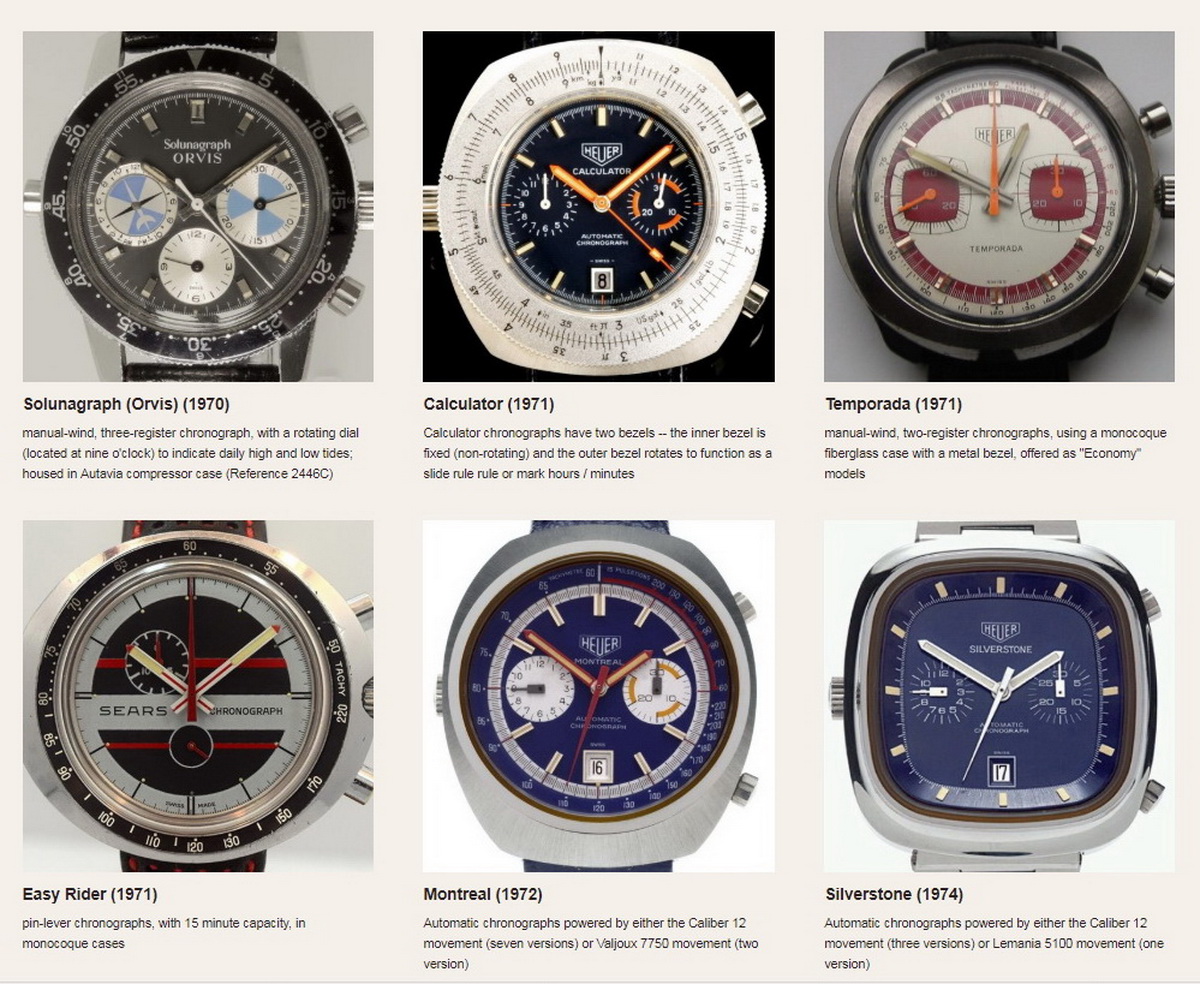 Let’s say that you have just found a Montreal chronograph, and want to do some research to get more information about your watch. The starting point is always the Index page of our chronographs, which covers 38 models or groups of vintage Heuer chronographs.