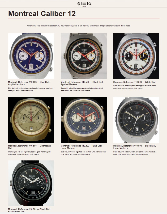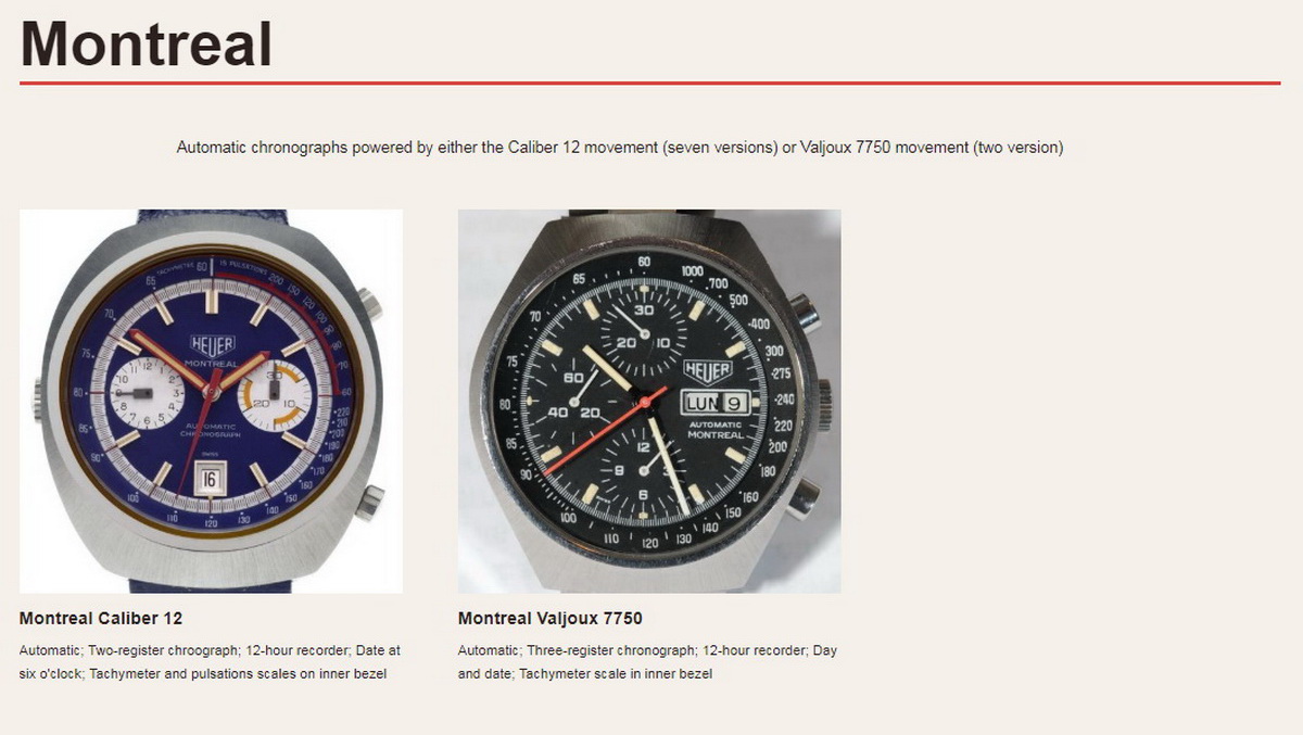 You click on the Montreal in the main chronograph index, and that will take you to the two main branches of the Montreal tree — the ones powered by the Caliber 12 movement and the ones powered by the Valjoux 7750 movement.