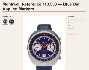 Your watch matches the left-hand watch on the top row, so you click there, and arrive in the Gallery for the Montreal, Reference 110.503 — Blue Dial, Applied markers.