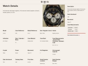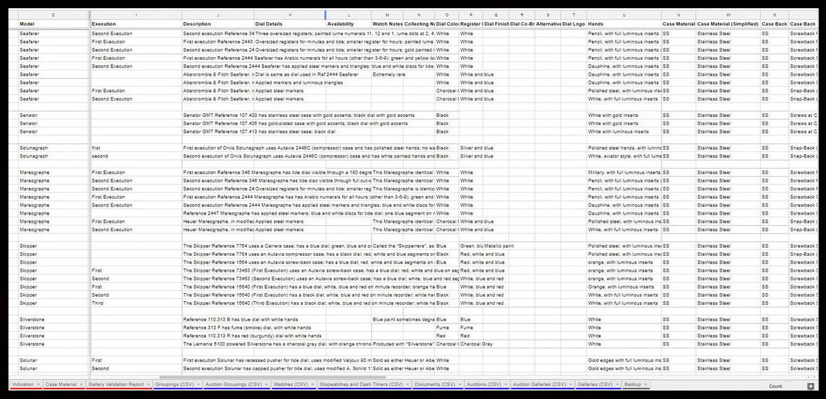 Some sections of the database are derived from our existing reference tables, and some sections of the database are entirely new (for example, the chronographs from the 1940s). Yes, the redesign of OnTheDash was a time consuming project, and building this database probably accounted for a full year of the work. Keep reading, and you’ll see why I believe that this was time well-spent.