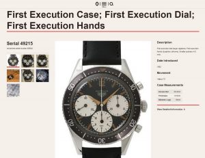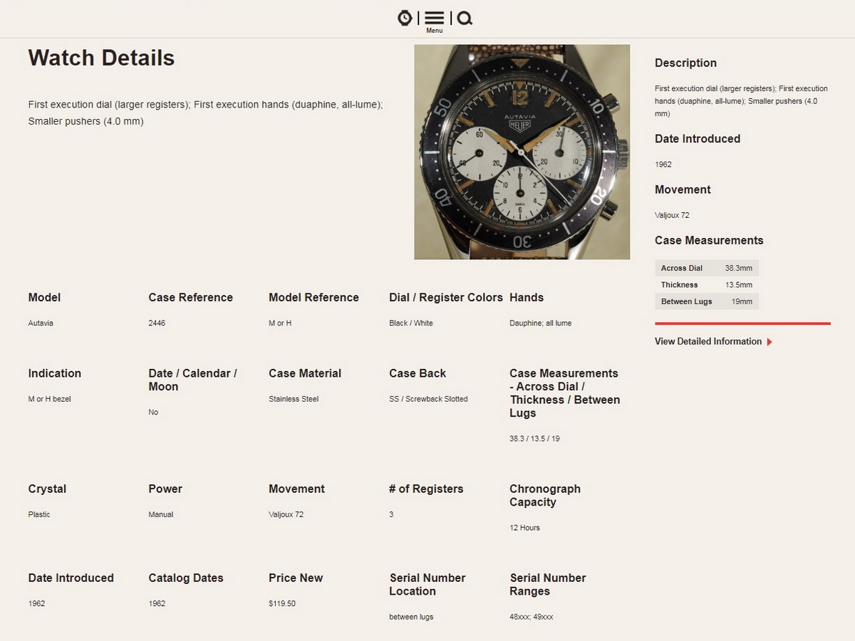 The heart of the new OnTheDash is a database that covers approximately 575 models and executions of vintage Heuer chronographs, from the mid-1930s through the mid-1980s. For each of these 575 models and executions, we present up to 30 fields of data – color of dial and registers; style of hands; case material and construction; movement; complications; dimensions; serial number range; catalog dates; price when new; etc. So visualize this database as a spreadsheet with 575 rows and 30 columns . . . for a total of approximately 17,000 fields of data.