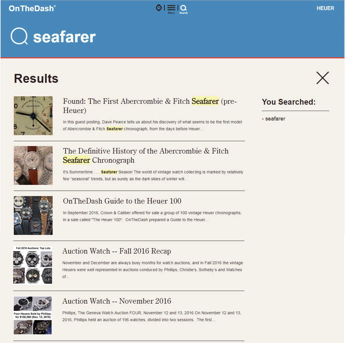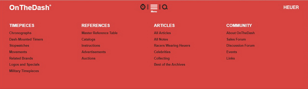 While the watch database is the most significant new feature of OnTheDash, in addition to covering the watches, the new site includes all the blog postings from the previous version of OnTheDash, as well as a lot of new postings. You can access all that content through the red Menu.