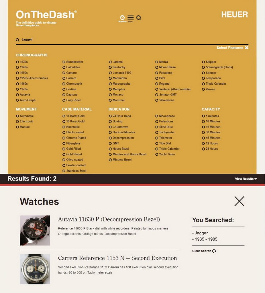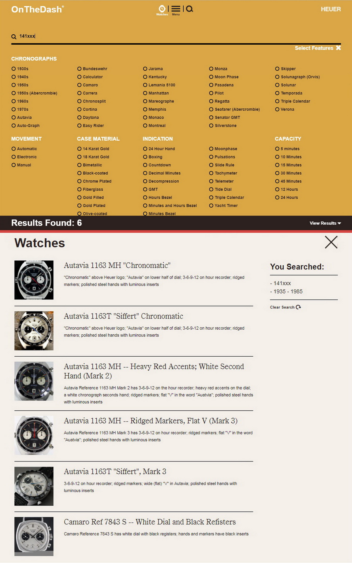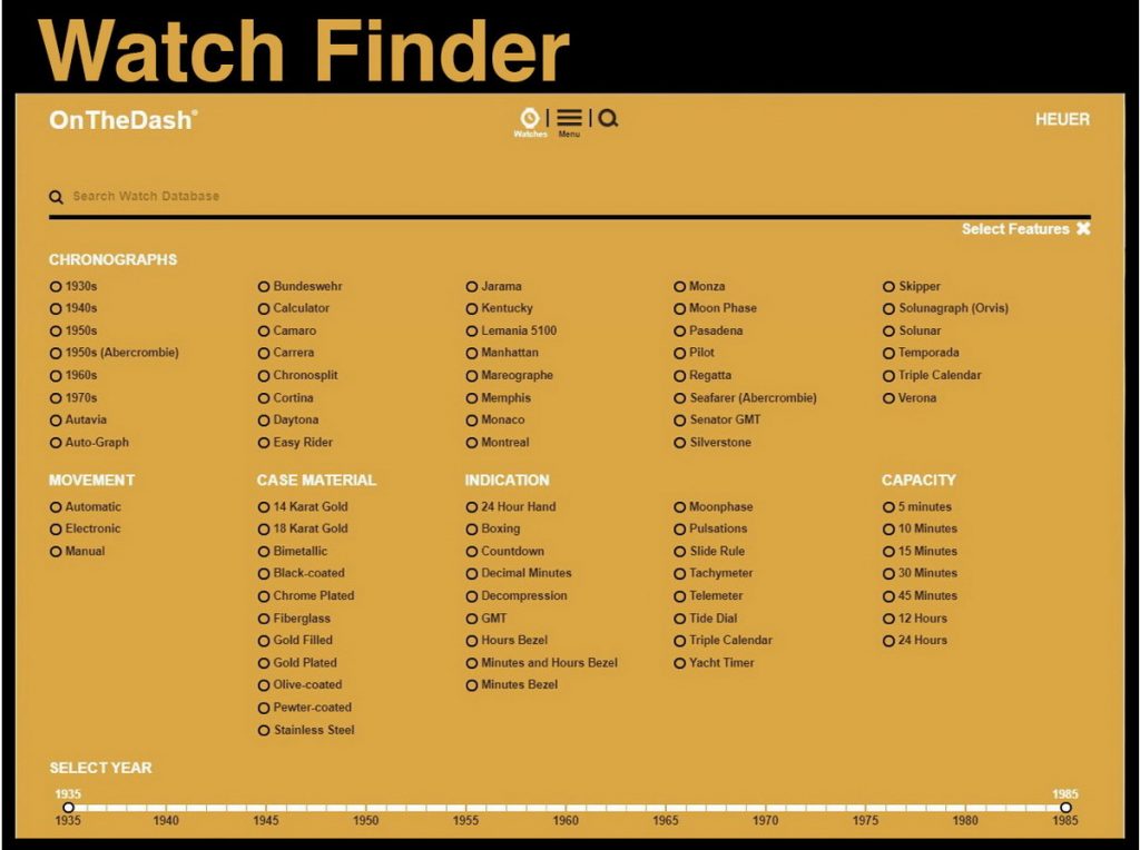 To address the needs of a broad range of users – from the reader discovering his first Heuer watch to the long-time collectors — the new OnTheDash offers three different ways to find watches.