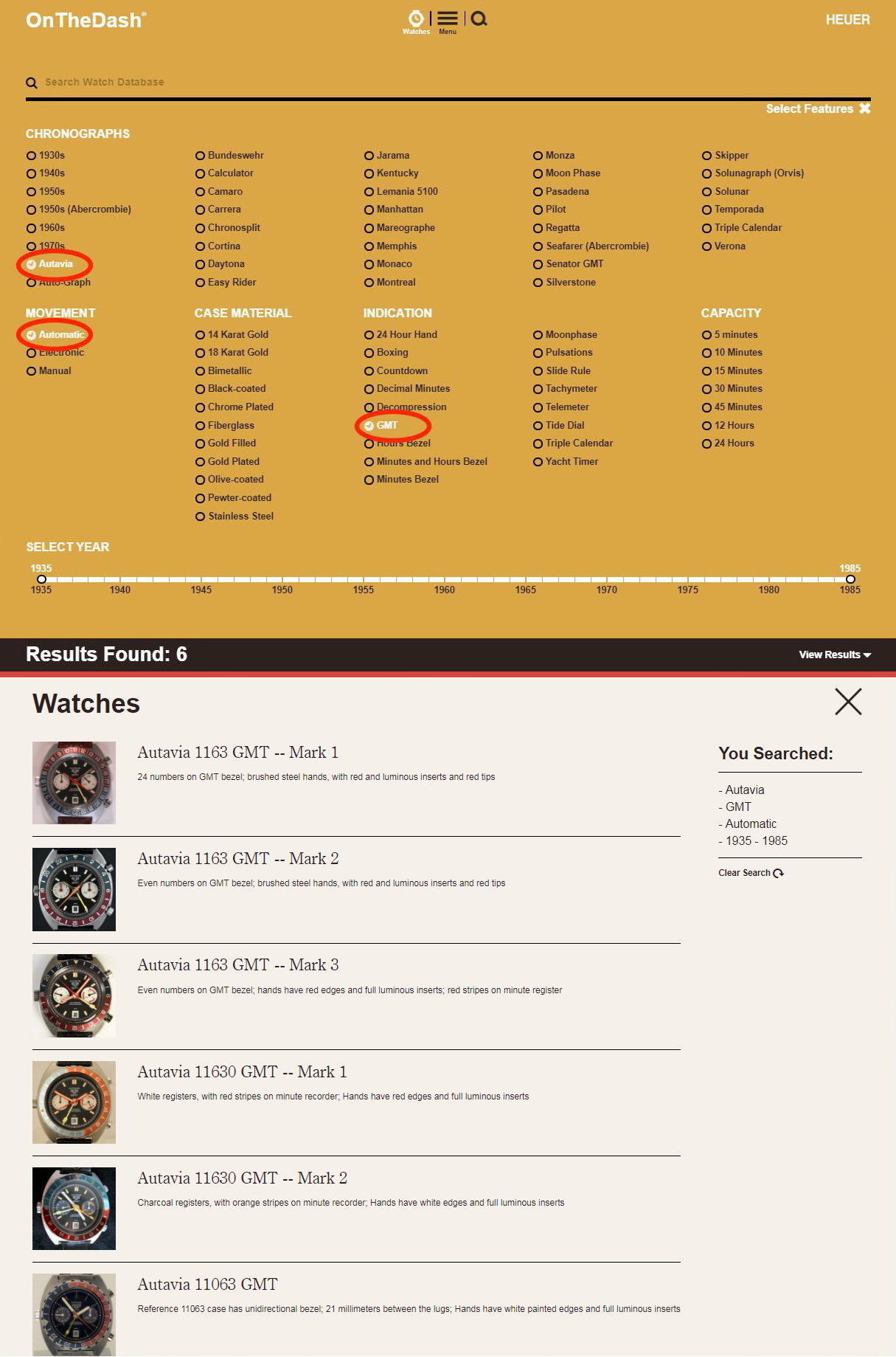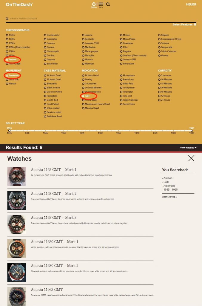 Let’s say for example, that you saw an interesting looking automatic Autavia GMT on the web, and you want to learn more about these watches. You simply select Autavia, Automatic and GMT with “Select Features”, and the Watch Finder shows you the six models made by Heuer.