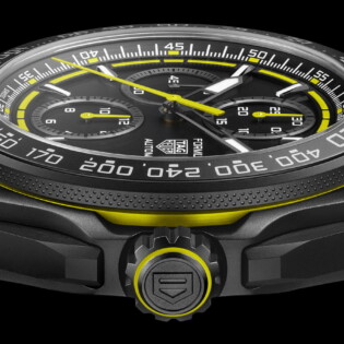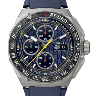 Just as Formula 1 cars are designed to generate power and deliver that power from the engine to the wheels, while allowing the driver maximum control, the new Formula 1 chronograph is also designed for reliable power and user ergonomics. The movement is TAG Heuer’s Calibre 16, a workhorse of the brand over the last two decades. The pushers take an entirely new shape; the crown might be part of a racecar’s gearbox; the rubber strap controls this power with ease.