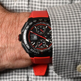 At TAG Heuer’s Atlanta Boutique, I was able to try on the three Formula 1 chronographs being released today and I was very impressed by these models. Strap the watch on your wrist and the first thing you will notice is the construction of the strap itself. The rubber is soft and the strap bends down easily from where it is attached to the case, so that it is snug against the wrist and adds relatively little circumference to your wrist. After struggling with complicated bracelets, fussy deployant straps and an assortment bulky straps in various materials, the simplicity and strength of the new Formula 1 chronograph straps was a pleasure. It’s comfortable and handles the mass of the watch well.