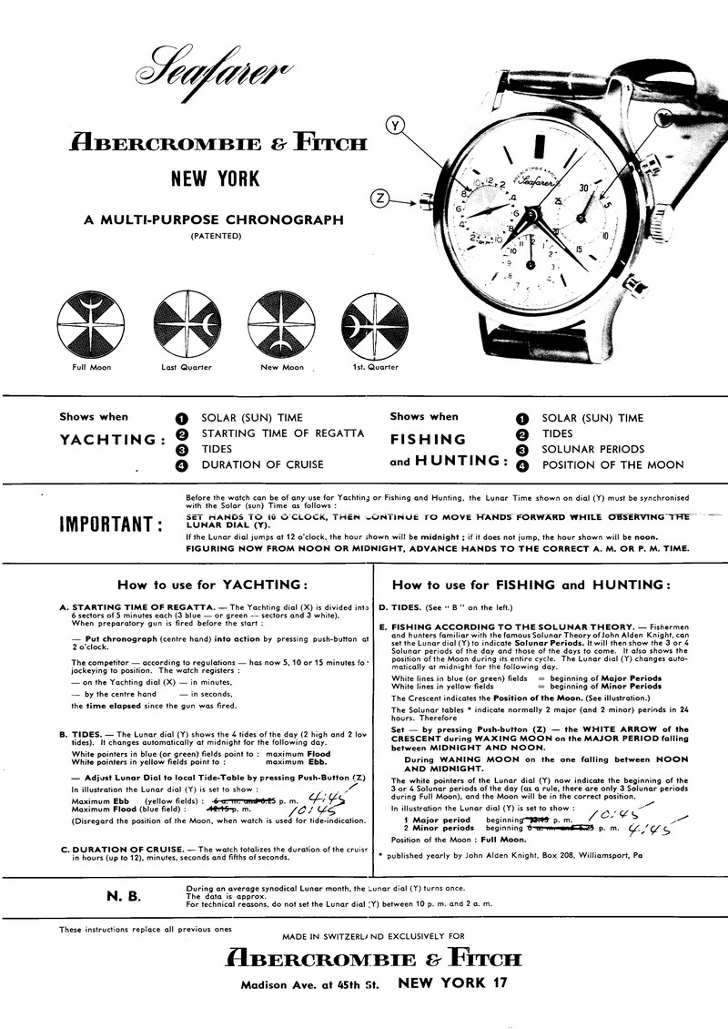 Heuer Introduced its line of "tide indication" chronographs in the early 1950's, with these chronographs being marketed by Heuer under the "Mareographe" name and by Abercrombie & Fitch under the "Seafarer" name. These chronographs included a unique indication that had not been included in chronographs produced by other manufacturers -- a tide indication. The dial on the left, at 9:00 (nine o'clock), shows when high and low tides will occur. Specifically, the cross in the center of this dial indicates the times for high and low tides, with the disc turning to match the moon's orbit. Accordingly, the points of the cross are not 12 hours apart, but are actually 12 hours and 25 minutes apart, to correspond to the cycle between high and low tides. The pusher on the left is used to set the disc for the correct high tide / low tide times in a particular location, and the disc then rotates to remain accurate.