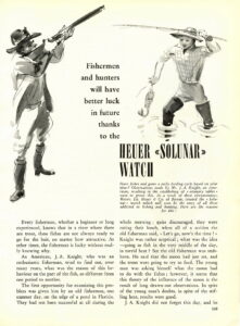 In the late 1940s, Abercrombie called on Heuer to produce a unique watch for hunters, fisherman and sailors, the “Solunar”. This watch would be based on the “solunar theory”, advocated by John Alden Knight, in the 1930s.