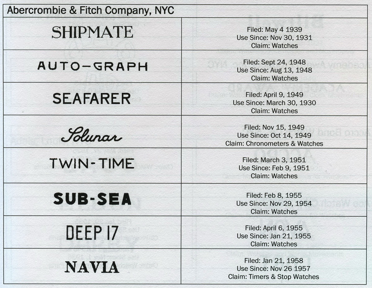 The trademark application on the ‘Seafarer’ name was filed by ‘Abercrombie & Fitch Co., NYC’ on April 9, 1949 but it indicated that the first use of the Seafarer name was almost twenty years earlier on March 30, 1930. The following image from the United States Horological Trademark Index, by Kurtis Meyers, also indicates the March 30, 1930 date, for Abercrombie’s first use of the Seafarer name.