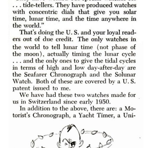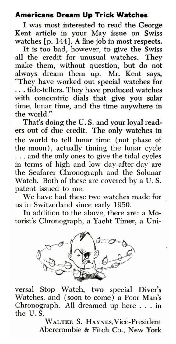 In the July 1955 edition of Popular Science, Walter S. Haynes (the then vice president of Abercrombie & Fitch) wrote a letter to the editor commenting on an article in the May edition about the Swiss watch industry. In his letter, amongst other things, Haynes refers to a yacht-timer which Abercrombie & Fitch had developed. Of course, Abercrombie & Fitch had produced stop-watch format yacht-timers from the early 1940s onwards, but perhaps this Seafarer wristwatch could be the yacht-timer referred to by Haynes.