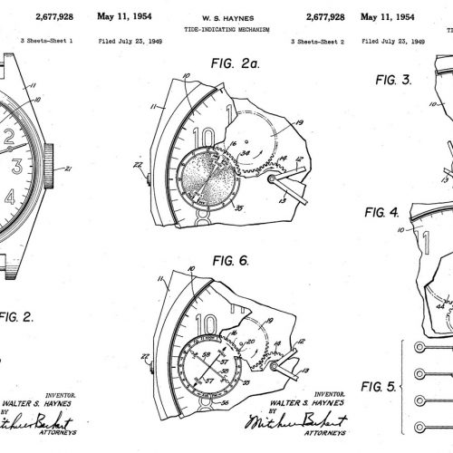 Related to this is the filing by Walter S. Haynes, the President of Abercrombie & Fitch, for a patent on a “Tide Indicating Mechanism” on a watch, in July 1949. This patent would be used for the Solunar watch, made by Heuer for Abercrombie & Fitch. This type of tide indication dial was also used in the Seafarer chronographs, introduced by Abercrombie in the early 1950s.