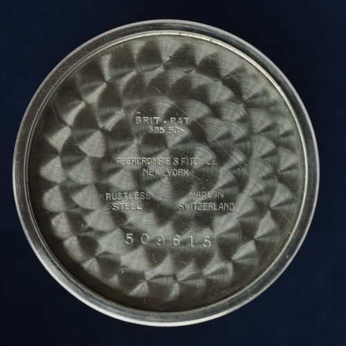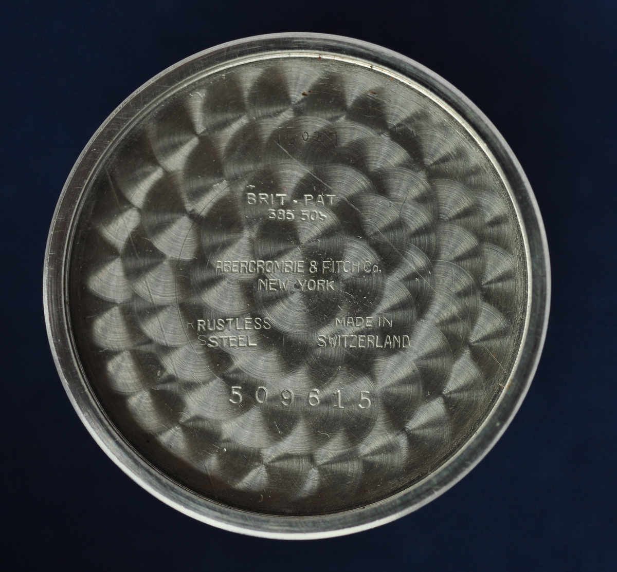 It is often hypothesised that Mido produced the Shipmate for Abercrombie & Fitch (mainly due to the visual similarities between it and the contemporary Mido Multiforts), but no hard evidence has ever been put forward. Mido themselves also state that there are no records of any collaboration between the two companies, but their archives are apparently incomplete for this period so ‘no record’ cannot conclusively prove no collaboration. Two other points to note are the presence of what appears to be a hand-scribed service mark (16027), and a hand-stamped attempt to write ‘Rustless Steel’ prior to the final markings.