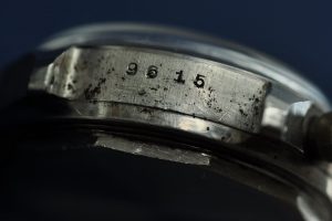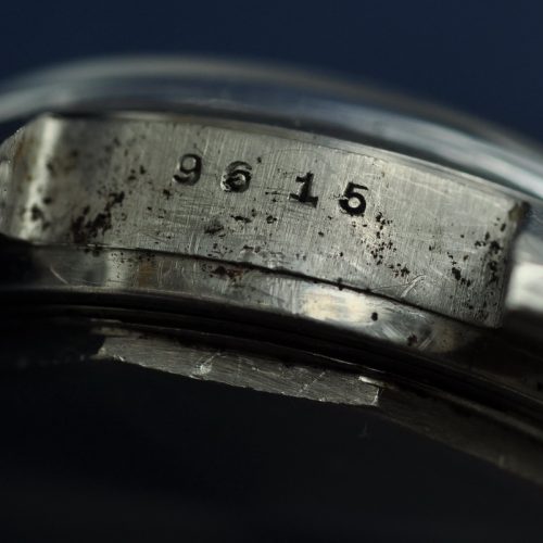 As was the style of the Mido chronographs, the case bears the last four digits (9615) of the complete serial number (509615) between the lugs at six o’clock. This serial number dates the case to 1938 according to the archives at Mido. The five o’clock lug is roughly marked on the reverse with a reference number, but it isn’t clear whether this is a service mark, some kind of inventory number, or something else.