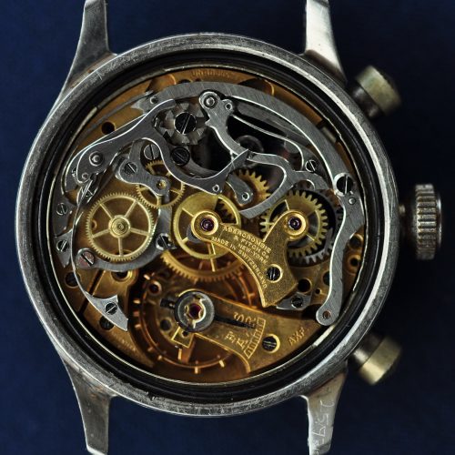 The movement arrived with significant water damage which probably occurred quite early in the life of the watch due to the relatively good condition of the case. The serial number 1484783 dates the movement to 1938/39, which matches well with the case date of 1938. The closest known serial number of a 13-20 movement in a surviving Multichrono is 1484907 (only 124 later), and this was fitted in a Mido case numbered 509645 (only 30 later).