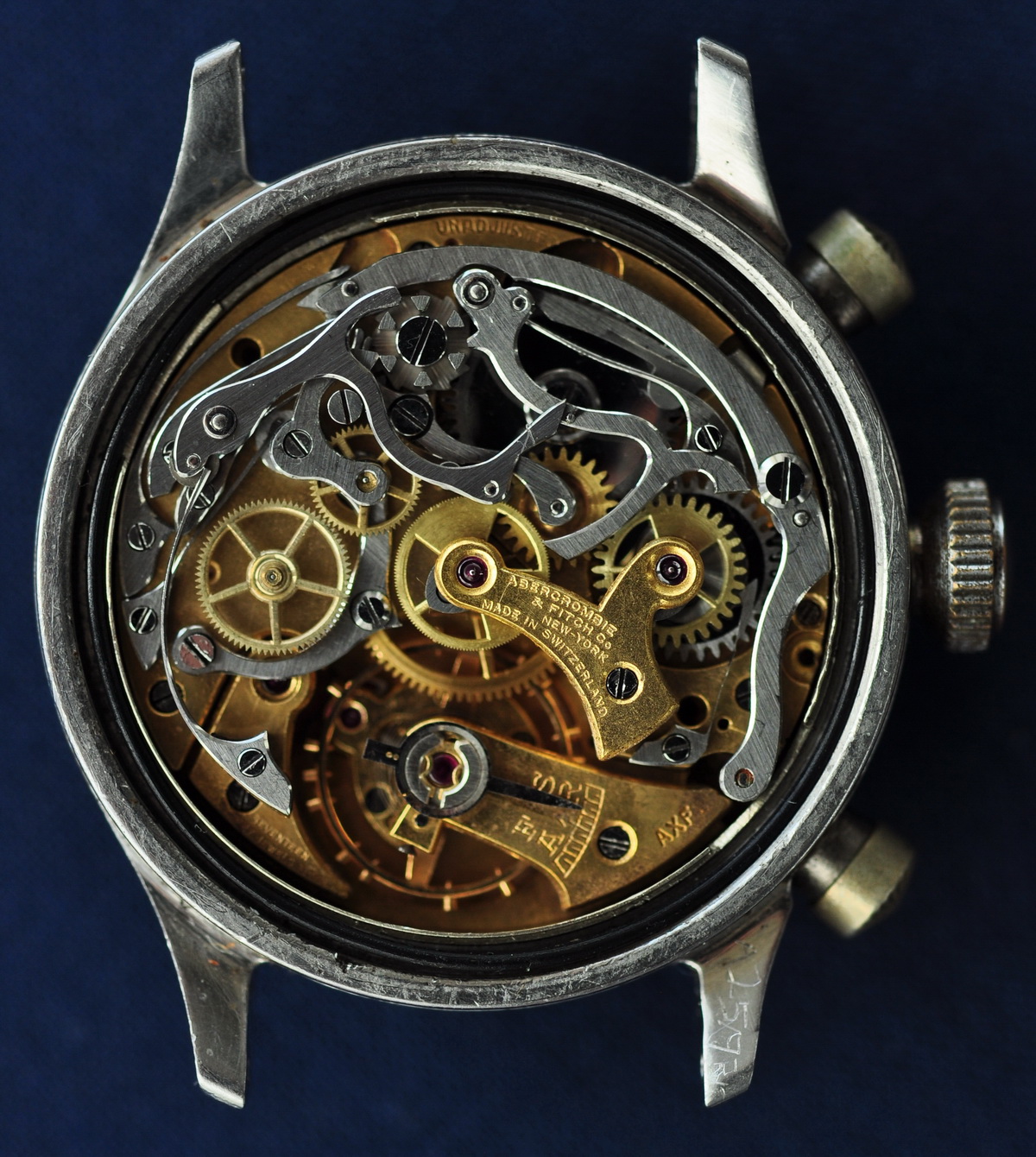 Due to the water damage the watch was essentially unrepairable with entirely original parts. Fortunately, all the original plates, bridges, and cocks were usable, so the identity of the original movement could be maintained. This was considered important as all the movement plates are stamped with the reference number 11 so they are a matched and original set. The original bridge is signed ‘Abercrombie & Fitch’ and the associated US import code (AXF) is stamped on the balance cock. A donor movement was still required to provide parts where the originals were unsalvageable. The selected donor movement came from a 1944 Minerva chronograph and was finished to a higher standard, so the repaired Seafarer movement now contains polished and bevelled levers. With hindsight I would have held out until an unfinished donor movement from a Multicrono could have been sourced.