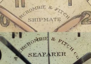 The front of the dial was covered in a thick layer of dirt, having spent decades floating around in a watchmaker’s drawer with no crystal installed. The font and style of the dial text is comparable with other late 1930s models, as in the example below when compared against a contemporary Abercrombie & Fitch Shipmate.