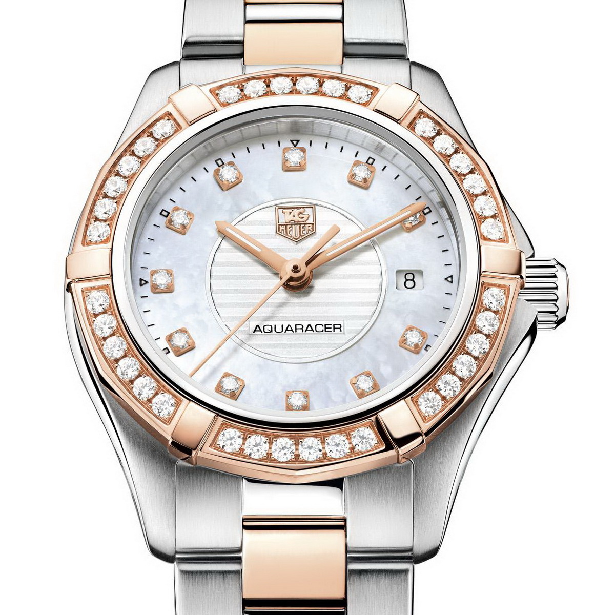 In Spring 2013, TAG Heuer introduced a new version of its Lady Aquaracer (Reference WAP1452). Measuring 27 millimeters across the dial, the stainless steel case of the new Aquaracer was decorated with rose gold and diamonds, with the mother of pearl dial also using diamonds to mark the hours. The central area of the dial has horizontal lines, evoking the motion of waves.