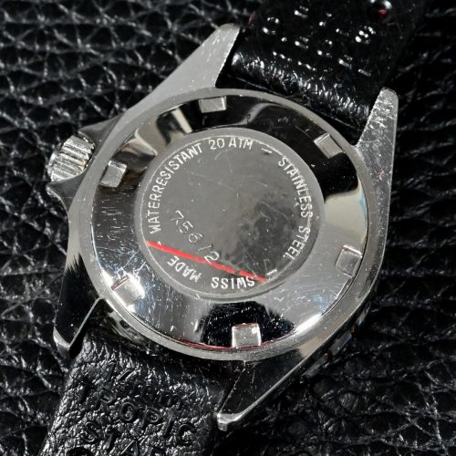 The Reference 756 is an automatic dive watch, with a distinctive red / black unidirectional bezel, marked in minutes. Once production of the Reference 756 dive watch had moved to Switzerland, Heuer began using the ETA Calibre 2671, a small movement (7-3/4 ligne) that was popular for women’s automatic watches. The Reference 756 watch measures 28 millimeters across the dial, with a thickness of 11.5 millimeters, and a lug-to-lug measurement of 35 millimeters. The Reference 756 uses a 14 millimeter strap, being sold originally on a “tropic” style rubber strap.