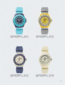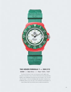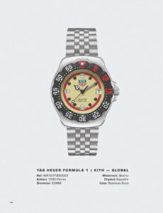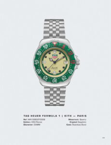 The book, TAG Heuer x Kith 2024, presents an illustrated catalog showing all versions of the Formula 1 watches and chronographs that TAG Heuer offered over the years 1986 to 1995. This catalog will be useful for today’s collectors, as sorting out the colors, sizes and materials of these watches and chronographs can be a bit of a challenge.