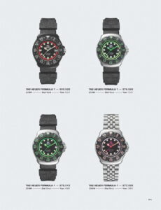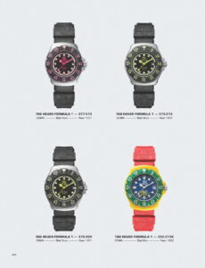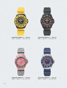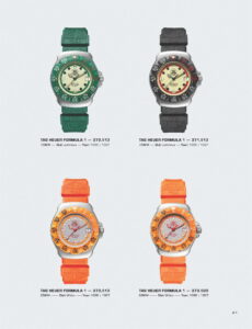 In connection with the introduction of these watches, TAG Heuer and Kith released a book authored by Nicholas Biebuyck (Heritage Director at TAG Heuer). This book covers the history of the original “first generation” Formula 1 watches, including an illustrated listing showing all versions of these timepieces, and also provides details on the 10 new “Kith Heuer” models. In this posting, we will present some highlights of the book; use the following link to see a PDF version of the entire book.
