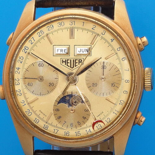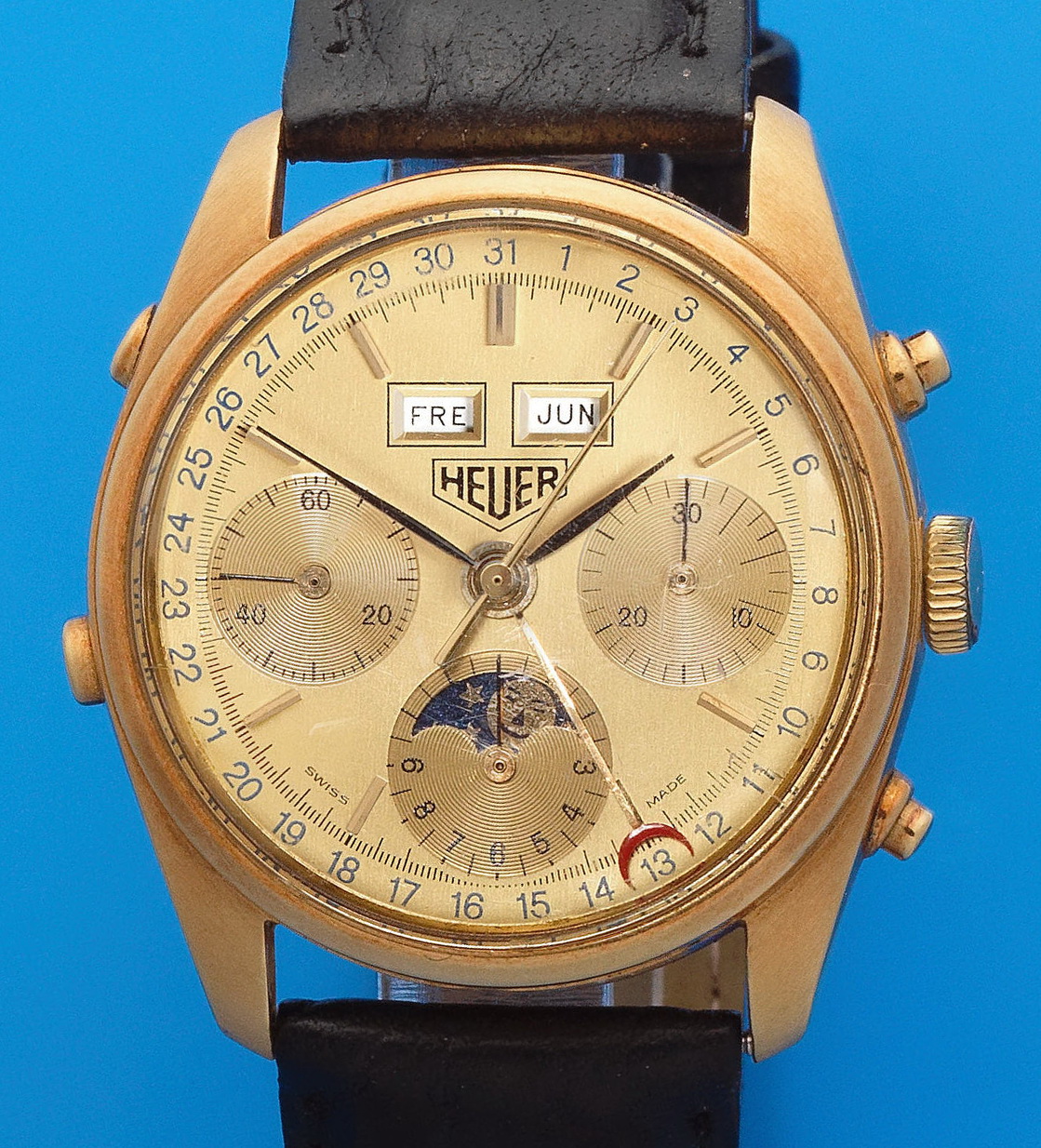 Golden Hours re-issue of triple calendar, moon phase chronograph (Reference 721.208) is manual-wind chronograph, 18 karat gold case, with round (waterproof) pushers; screw-back case