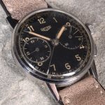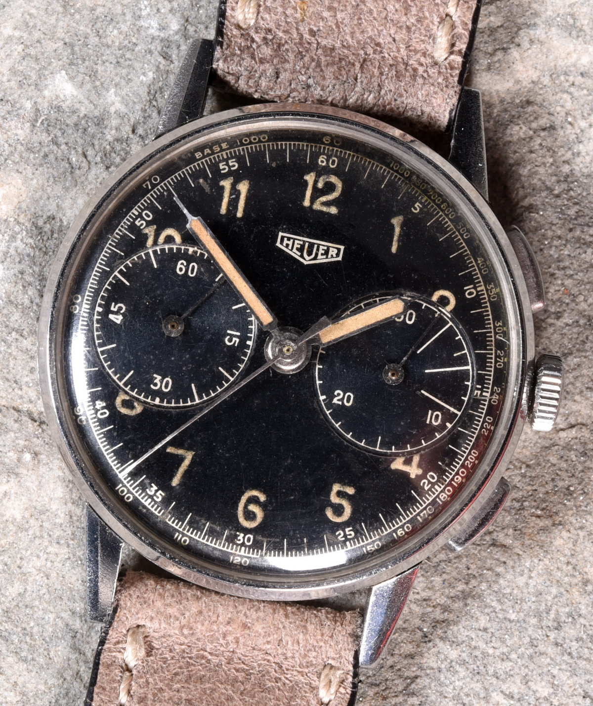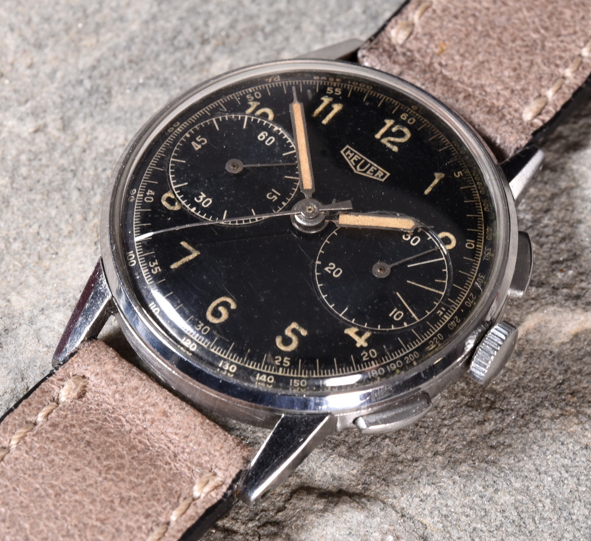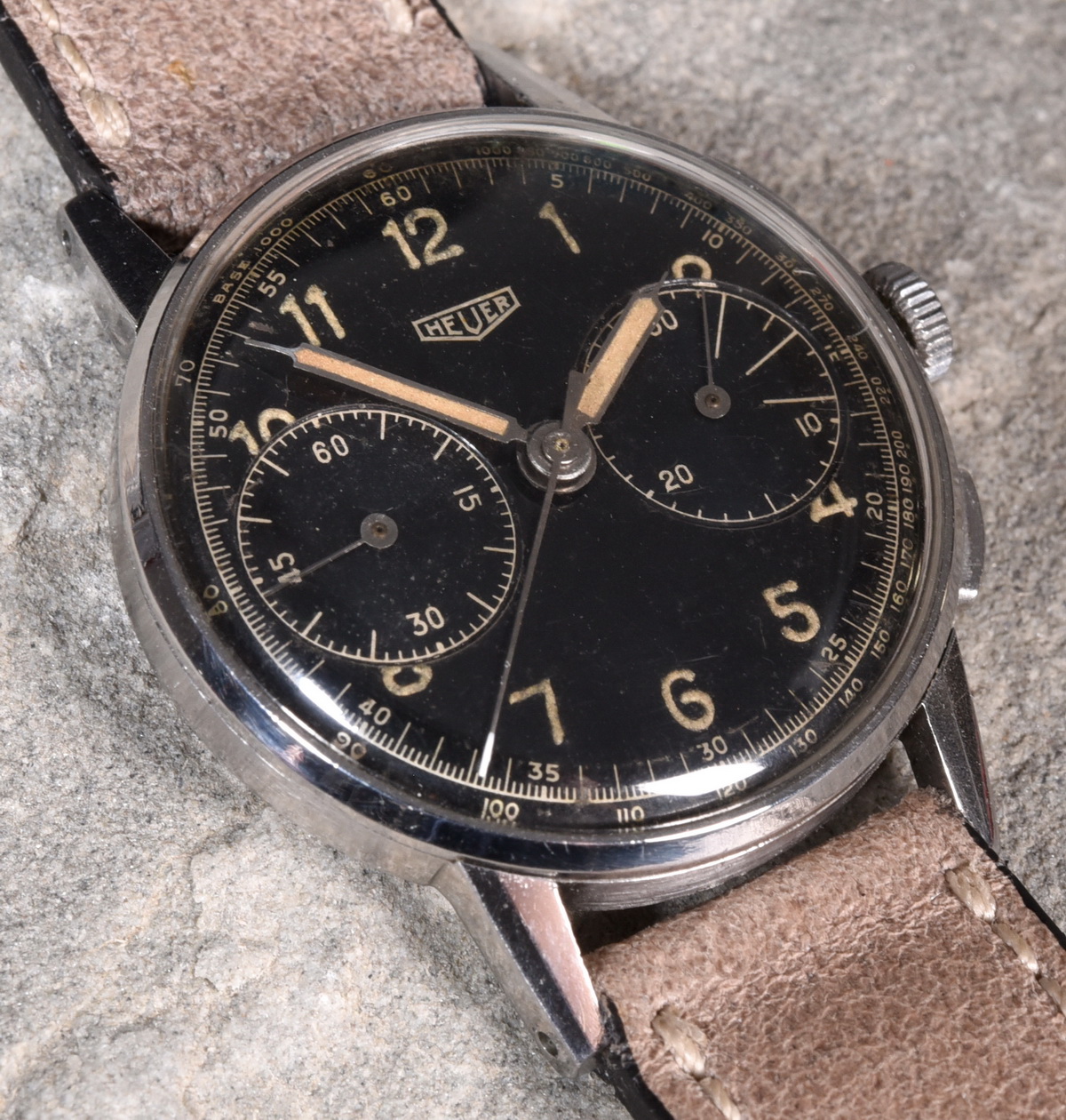 Black radium dial, with Aravic numerals and a tachymeter scale