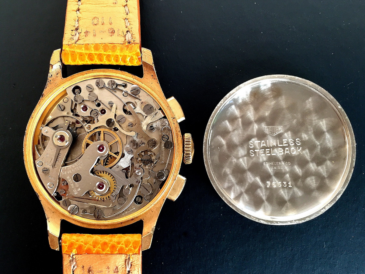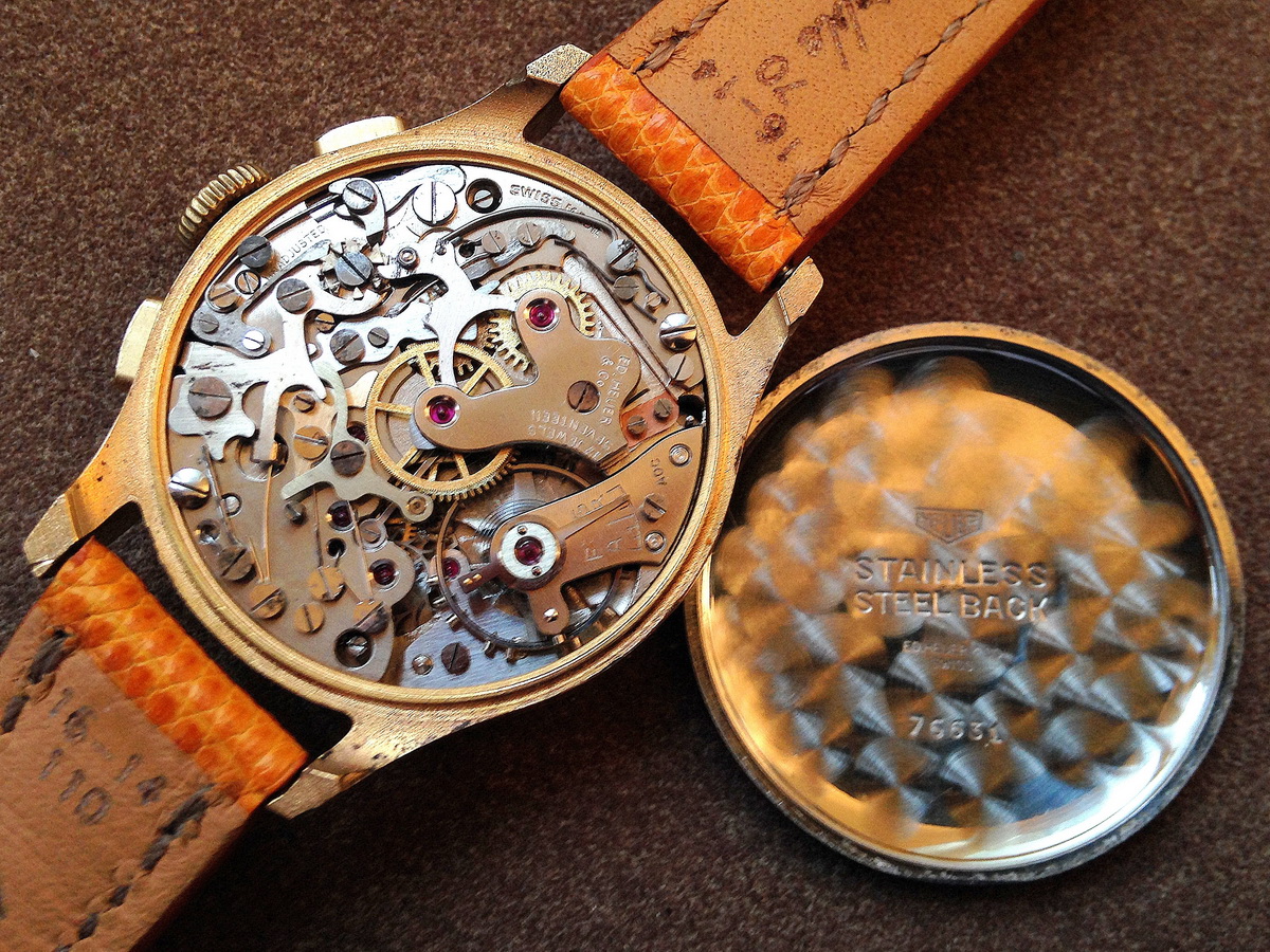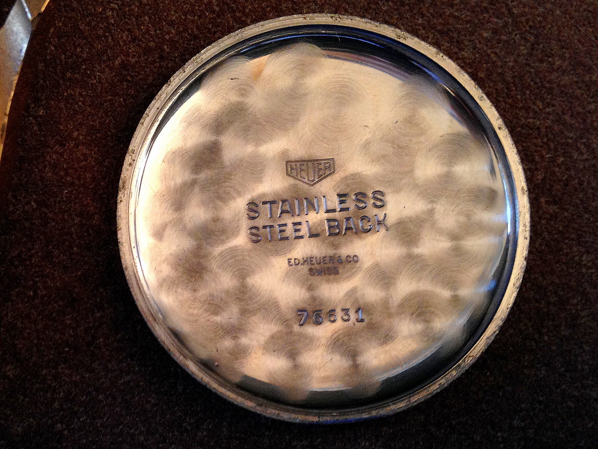 Reference 3248 T is an "up / down" chronograph, with the "Heuer" shield within the top recorder; Tachymeter scale on dial (60 to 1000); powered by Valjoux 77 movement.