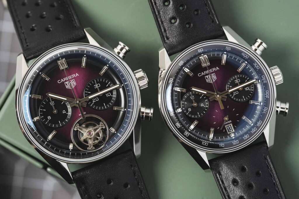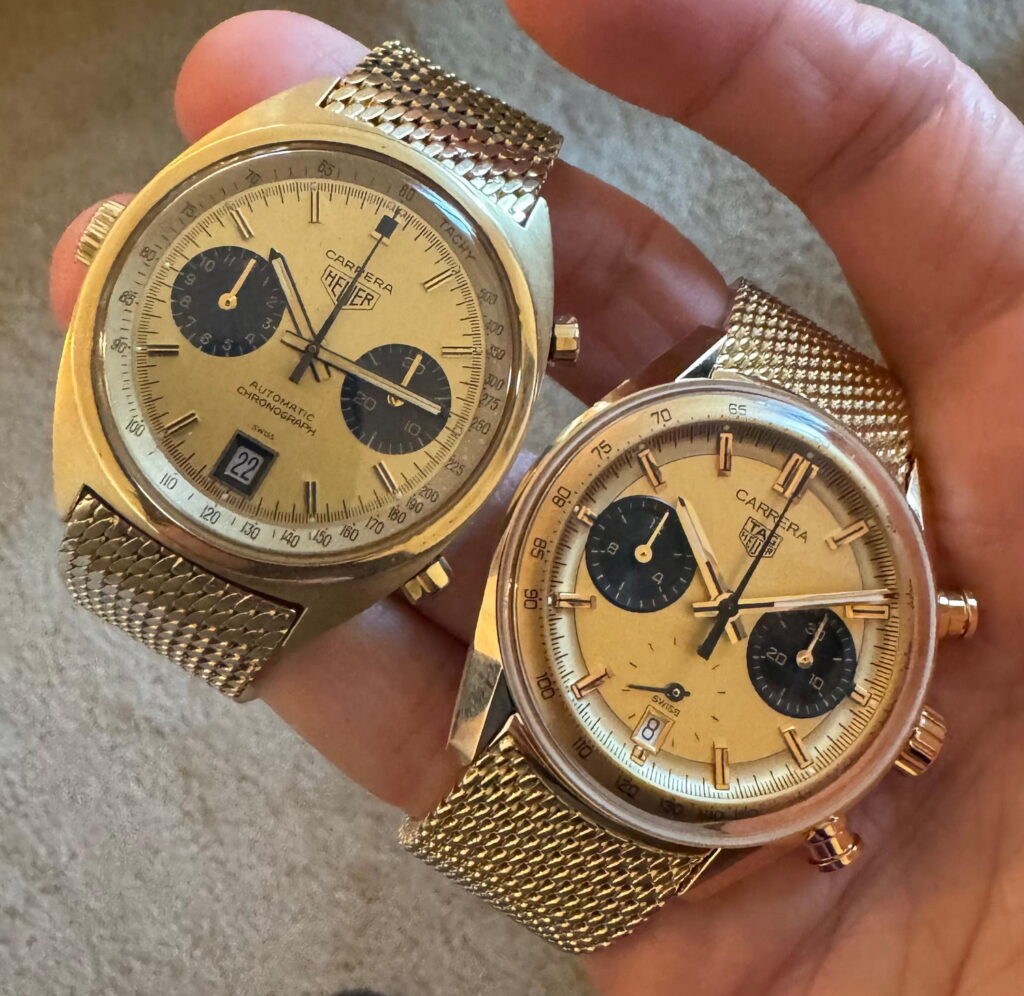 Most models of the second generation Glassbox Carrera measure 39 millimeters across the dial (as shown on the right below), although TAG Heuer has also produced 42 millimeter cases that use the same Glassbox construction (shown on the left below).
