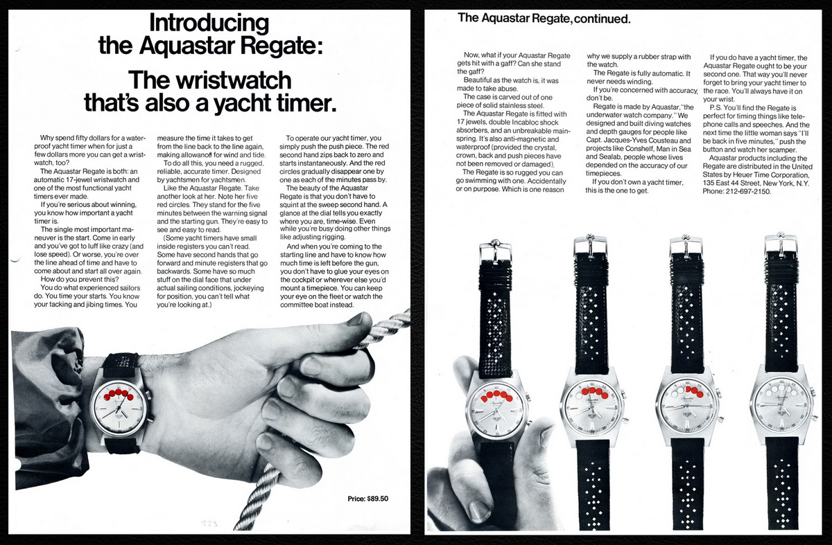 Through the 1930s, 40s and 50s, Heuer produced stopwatches and timers for yacht racing, but it did not offer a wristwatch for the racers. This changed, around 1964, when Heuer entered into an arrangement with Aquastar, the prominent maker of wristwatches and chronographs for diving and sailing, for the Aquastar “Regate” chronograph to be co-branded for Heuer. Priced at $89.50, Heuer’s advertisements posed the question, “Why spend fifty dollars for a waterproof yacht timer when for just a few dollars more you can get a wristwatch too?”