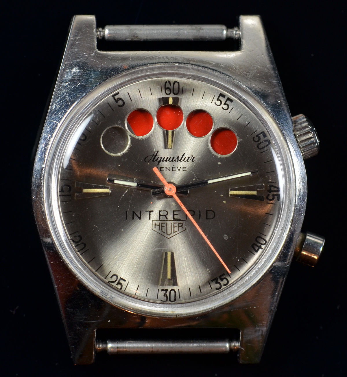 Patented in 1964, the Aquastar Regate used five disappearing red balls to count down to the start of a yacht race. When the pusher is pressed, the five red balls appear, and the second hand flies back to zero and starts running. After five minutes, the red balls have turned to silver, “disappearing” as they match the silver of the dial.