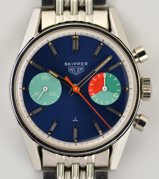 Heuer marked Intrepid’s victory with the creation of an entirely new chronograph model – the Skipper. Derived from the two register Carreras of the day, the new Skipper (Reference 7754) featured a metallic blue dial, with a light green register for running seconds.