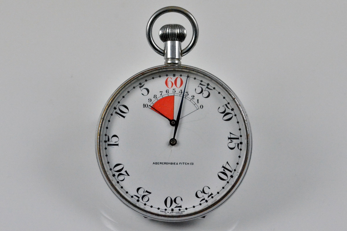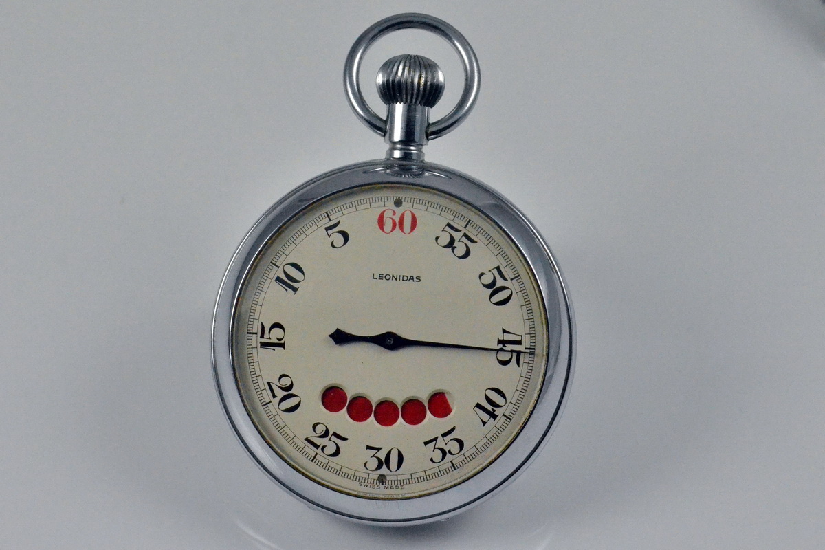 — With the layout of a conventional stopwatch, the small, circular minute recorder counts down the minutes from 5, 10 or 15, corresponding to the horns sounded by race officials. The outer scale counts down the seconds, with markings from 55 to zero.