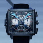 Compared with any other watch previously produced by TAG Heuer, the new Monaco Split-Seconds Chronograph makes the boldest use of sapphire. We are accustomed to seeing sapphire used for two crystals – the front crystal that covers the dial and hands and the crystal incorporated into the case-back to create a “display back”. On the newest Monaco, the dial itself is made of sapphire and the entire case-back is a piece of sapphire.
