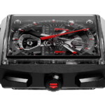 In the 1950s, Heuer redesigned the favorite tool of the racing and rally crowd to offer enhance legibility and a protective carrier, in a 57 millimeter case, with the bright white dial with large black Arabic numerals replacing the previous Breguet numerals and hands. Today, TAG Heuer has created a “hybrid” case of titanium and sapphire that will feel right on the wrist, while displaying its beautifully-decorated titanium movement.